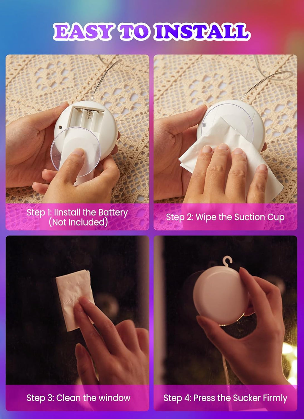 • Suction Cup & Stickers Hanging Lights: Easy to install on glass doors, windows, or ceramic walls.