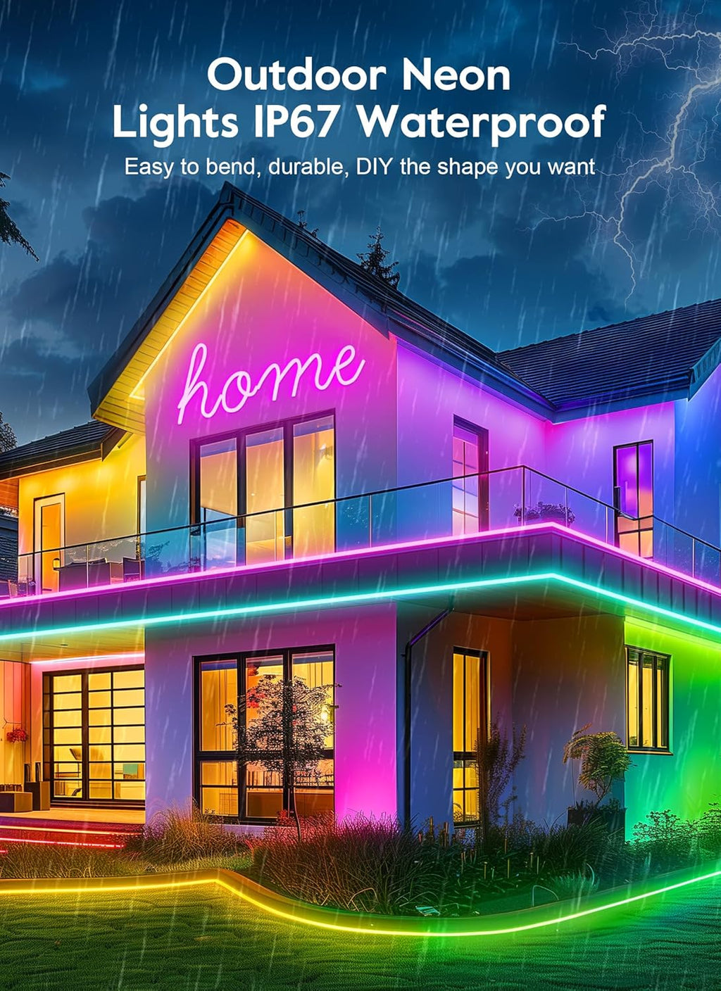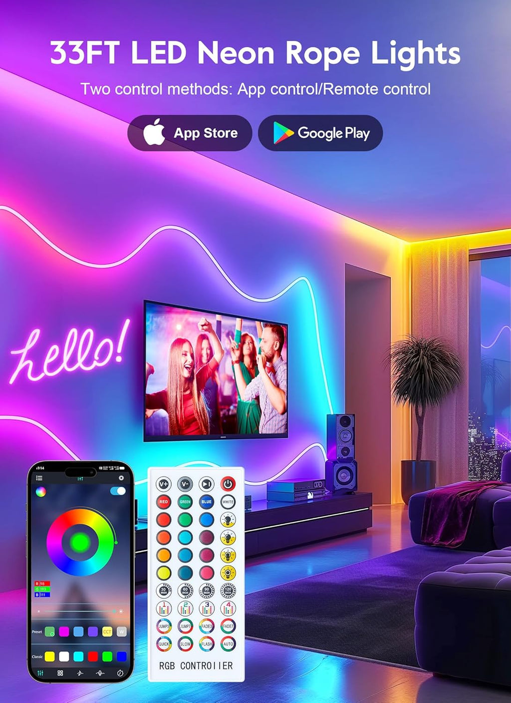 33Ft RGB LED Neon Rope Lights - App/Remote Control, IP68 Waterproof