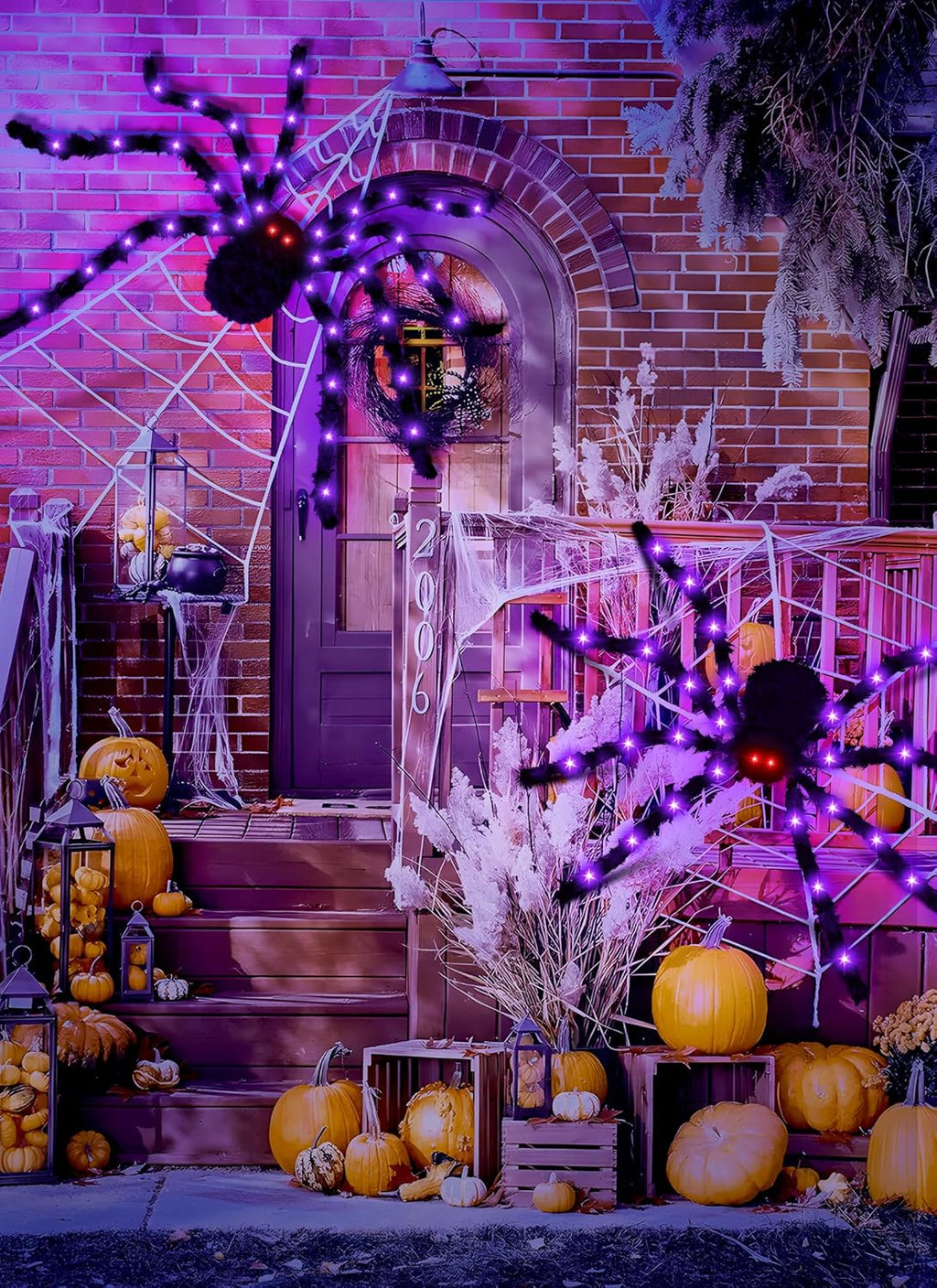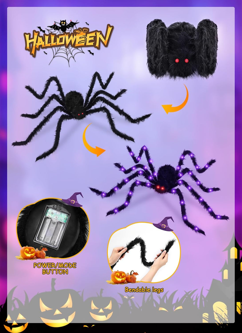 • Creepy Glow: Equipped with 38 LED lights—2 red for the eyes and 36 purple for the legs—this spider creates a chilling atmosphere in the dark.