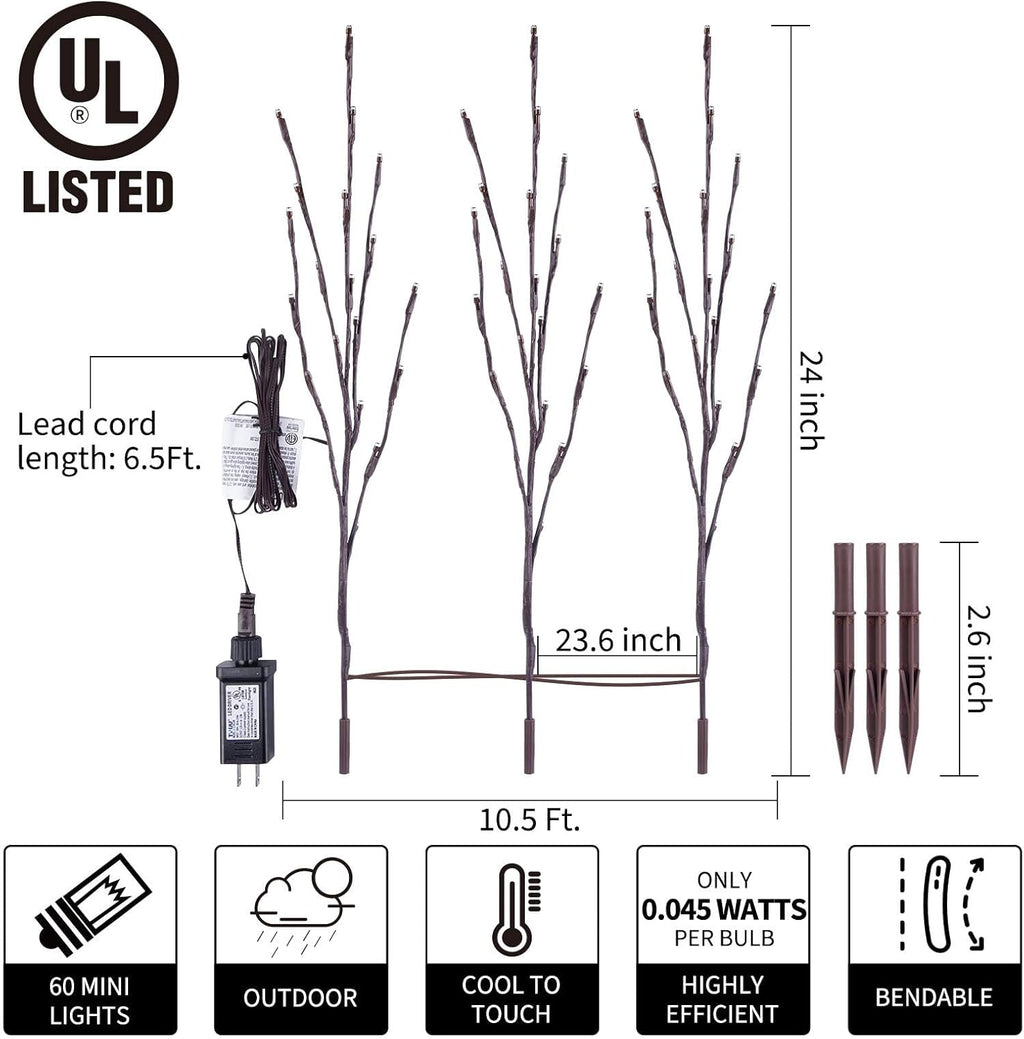 • Pretty vase filler: Branches string lights, 24" height with 23" proper spacing, with 78 inches flexible lead cord, more vases can be arranged, amazing ornaments for real or artificial flowers, centerpieces, with 3 ground stakes, extremely suitable for planting with flowers in garden or potted landscape, earthy but soulful reinforcements