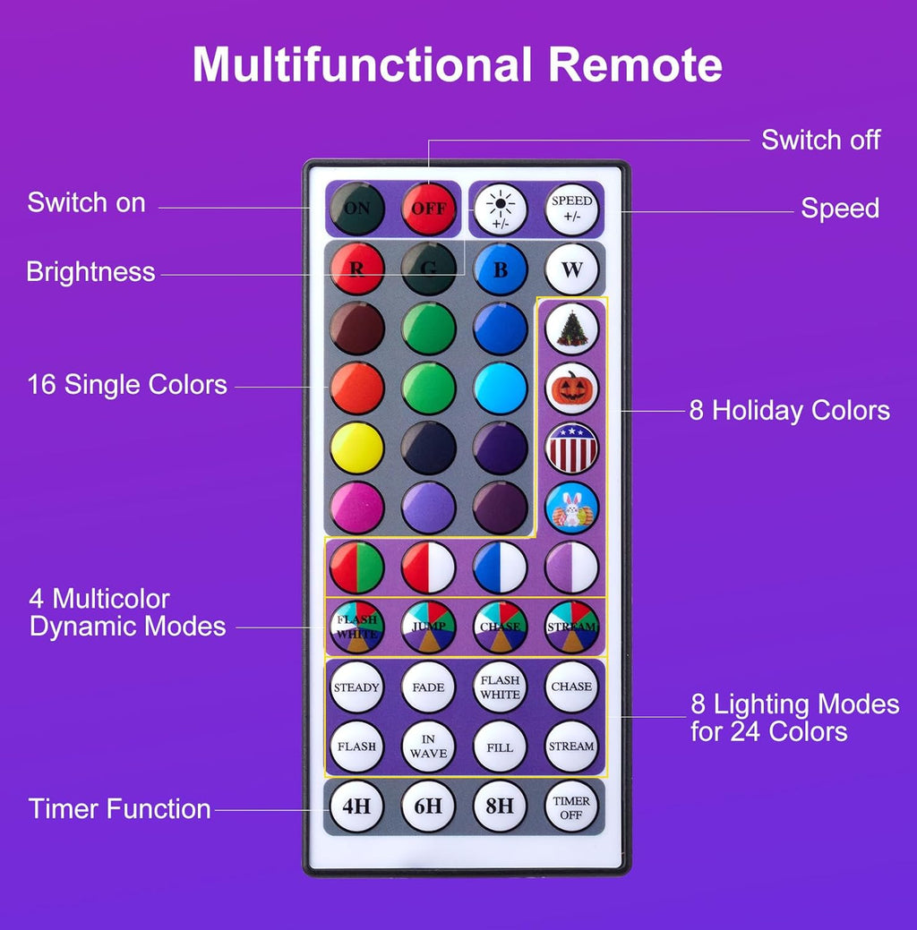 • Timer & Adjustable Settings: Adjust brightness and speed with a timer for 4, 6, or 8 hours. The remote has a range of up to 16 feet.Rope Lights