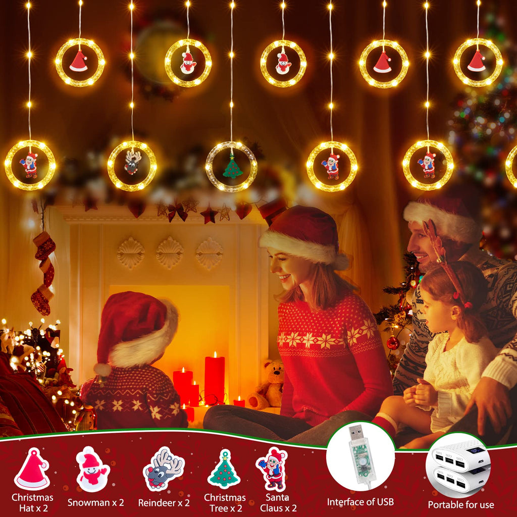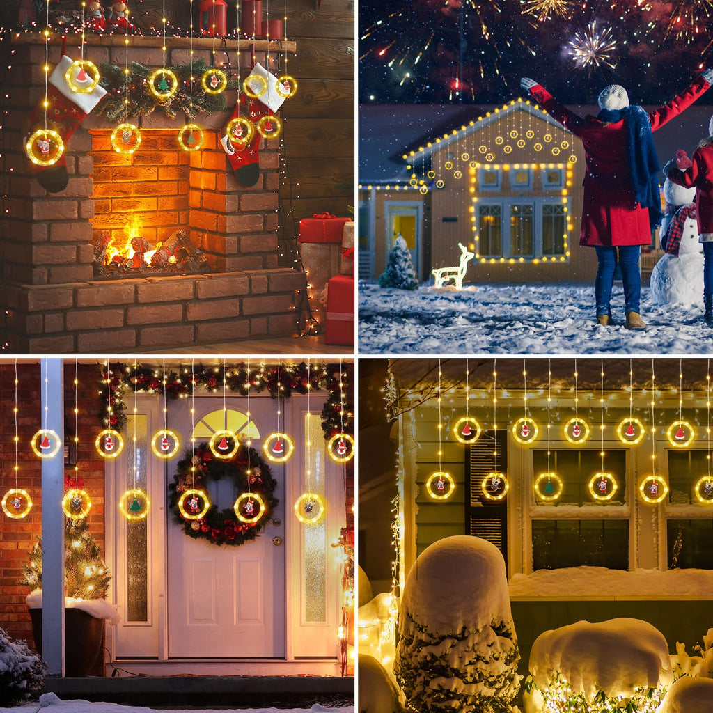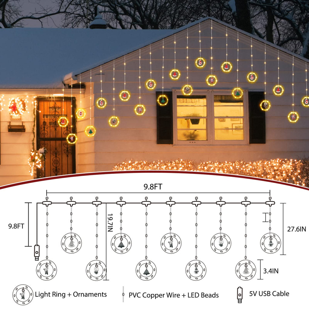 Christmas Curtain String Lights, Rings & Detachable Rubber Ornament