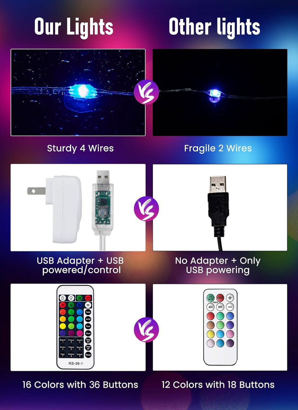 • Remote Control: Turn lights on/off, change to one of 16 colors, adjust brightness, cycle colors, and set a 6-hour timer.