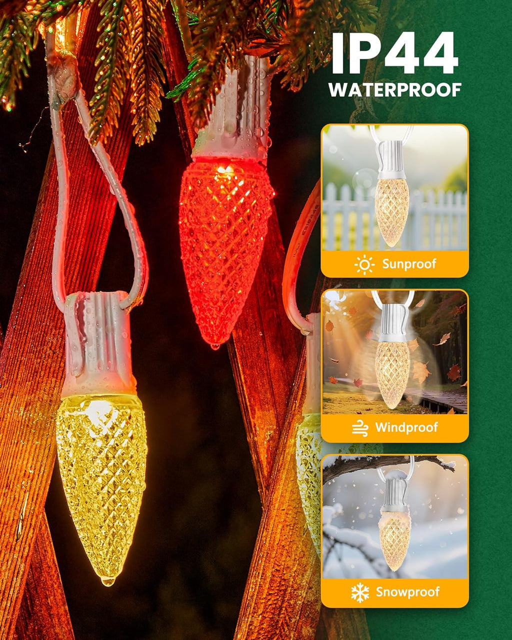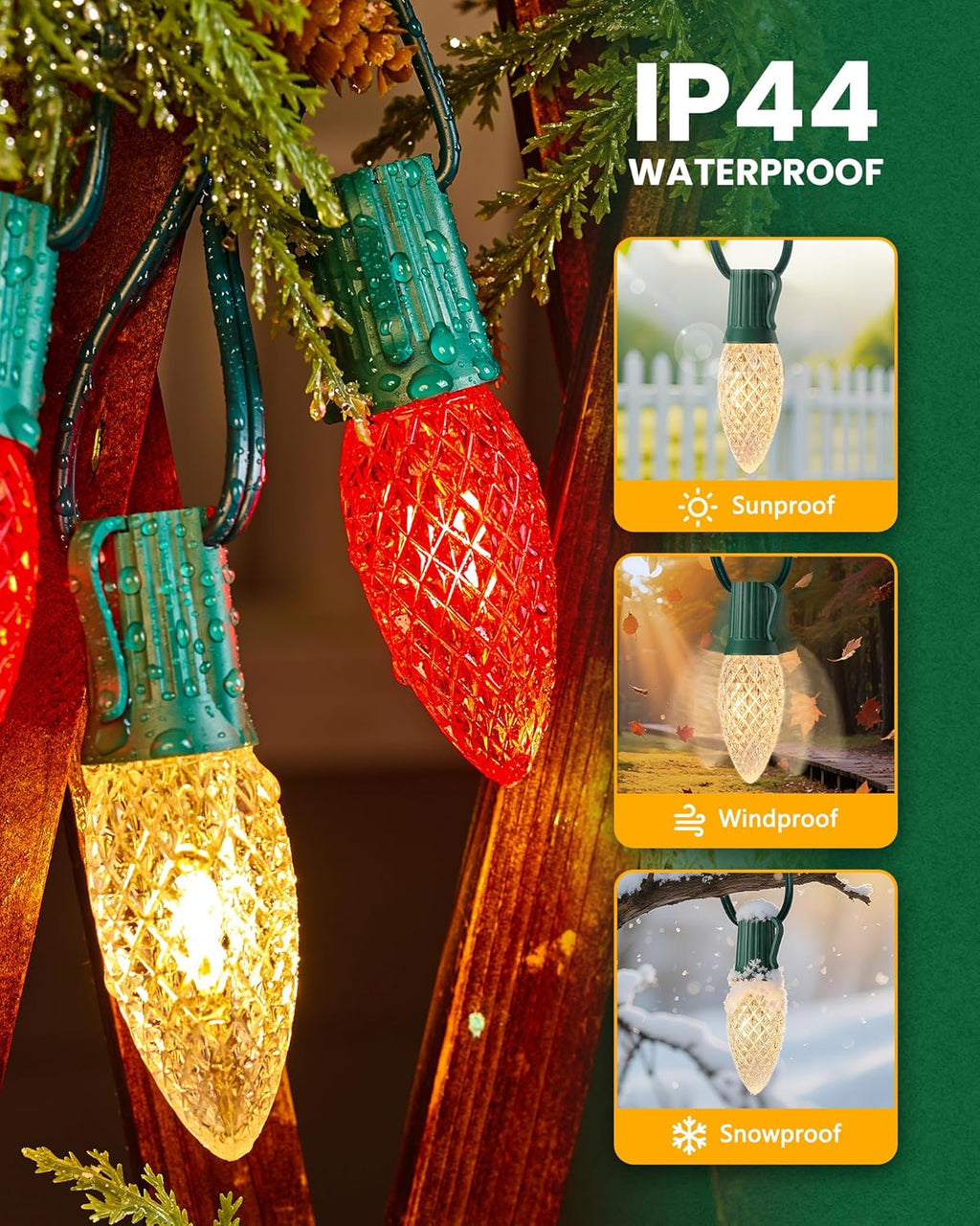 【Waterproof Design】Engineered to withstand harsh weather conditions, these C9 light strings deliver reliable indoor and outdoor performance across multiple seasons. Perfect decoration ideal for terraces, courtyards, gardens, cafes, fences, bushes, balconies, stairways, Christmas trees, and more.