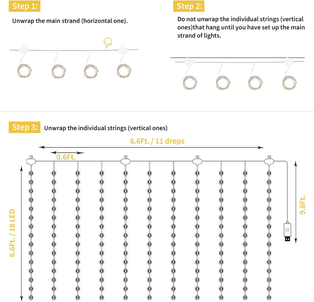 Easy Installation: Take out the LED curtain lights, hang it on some where you want to put, keep them a little loose so they can easily move across your rod; Note: Please do not unwrap the individual strings until you have set up the main string of lights