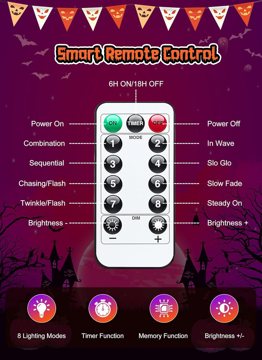 • Customizable Lighting Effects: Choose from 8 lighting effects and 4 brightness options to create the perfect spooky ambiance for your Halloween decor.