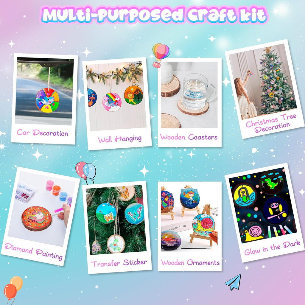 • Comprehensive Craft Set: This kit includes 26 wood slices, 10 wooden ornaments, 4 felt sheets, 40 wiggle eyes, 4 glow-in-the-dark paints, 4 glitter glues, 4 transfer stickers, 2 diamond pens, 5 clays, 2 diamond plastic trays, 25ML glue, 1 color palette, 2 brushes, 33 FT jute twine, 12 acrylic paints, and 2000 acrylic diamonds. Ideal for wood chip painting, it sparks your child's imagination and creativity.