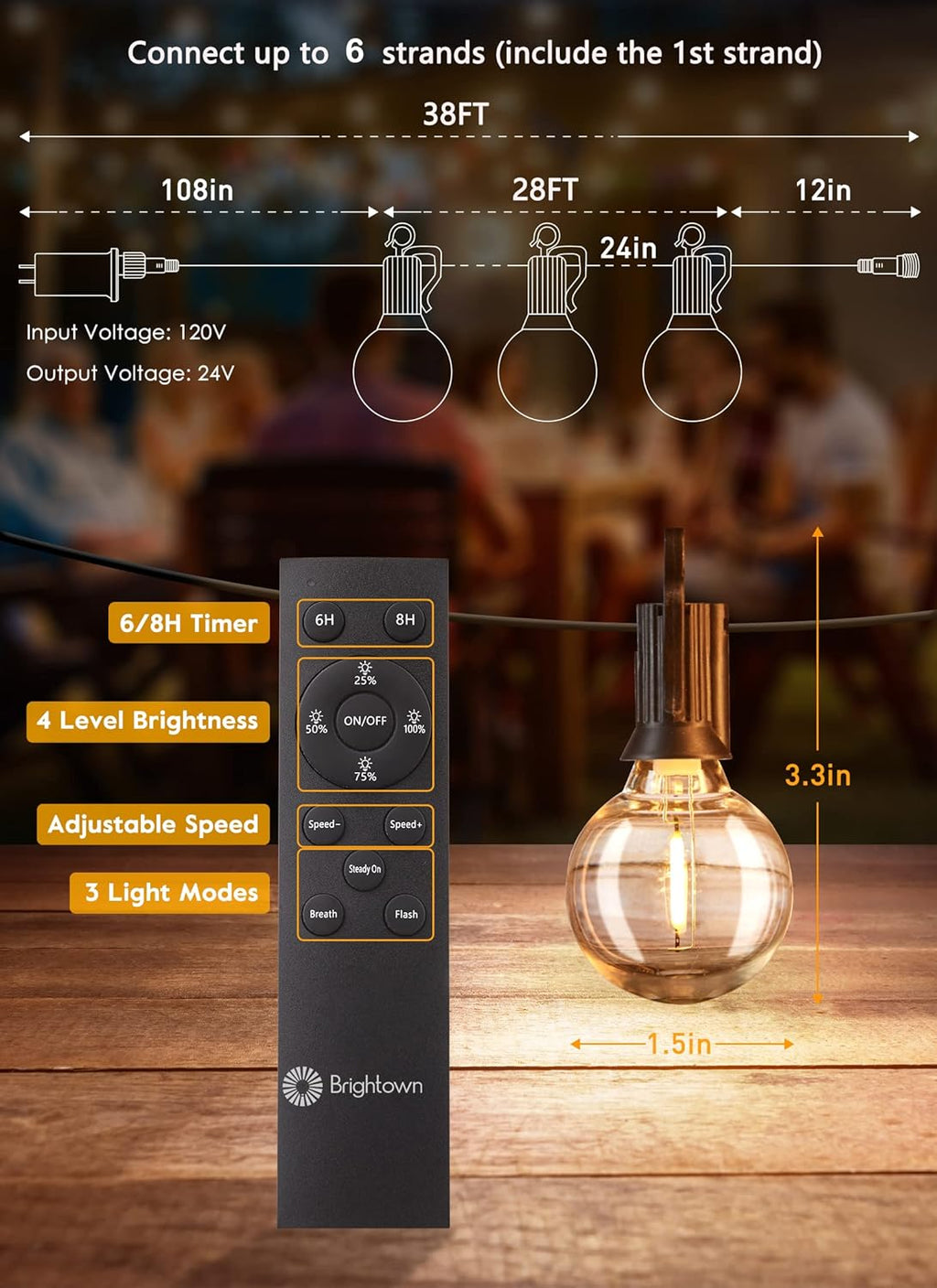 • Multifunctional Remote: Control the outdoor patio lights with 4 brightness levels (25%, 50%, 75%, 100%), 6H or 8H timer settings, and 4 lighting effects—all without needing an additional timer or dimmer.