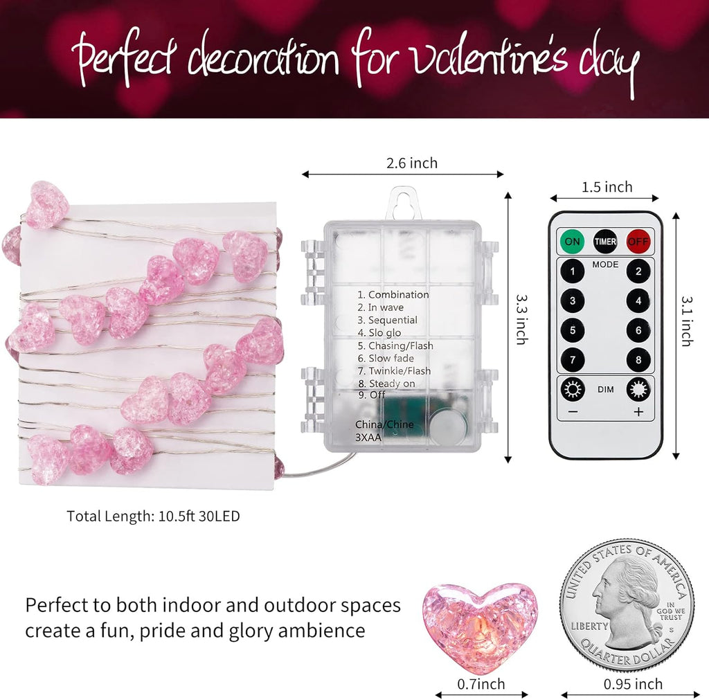 • Length & LEDs: 10.5 feet long with 30 mini pink heart-shaped LEDs.