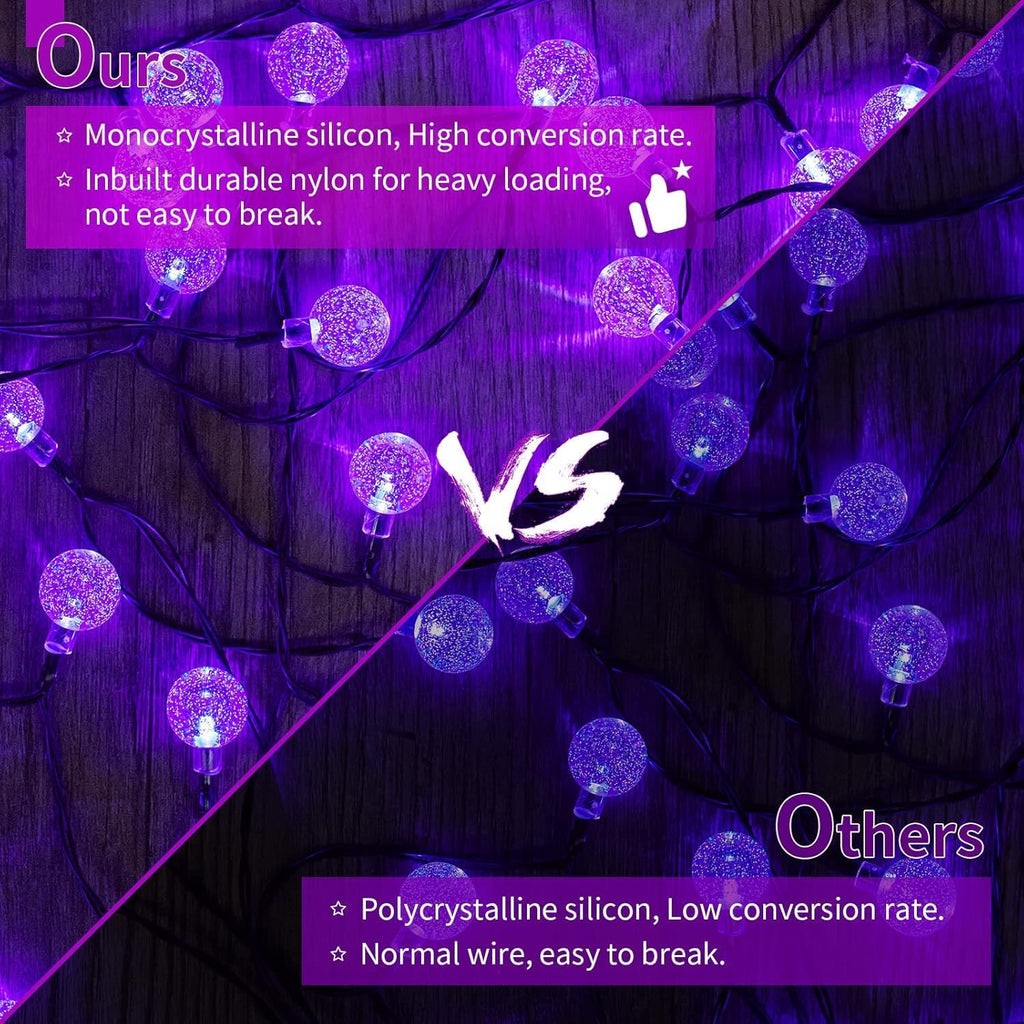 • Solar Powered & Auto On/Off: 36ft 60 LED purple string lights powered by solar energy feature an adjustable monocrystalline silicon solar panel for better energy conversion. No need to replace batteries or incur extra electric costs; a light sensor controls the solar lights to turn on at dark and off at daytime.