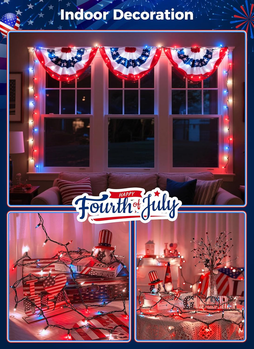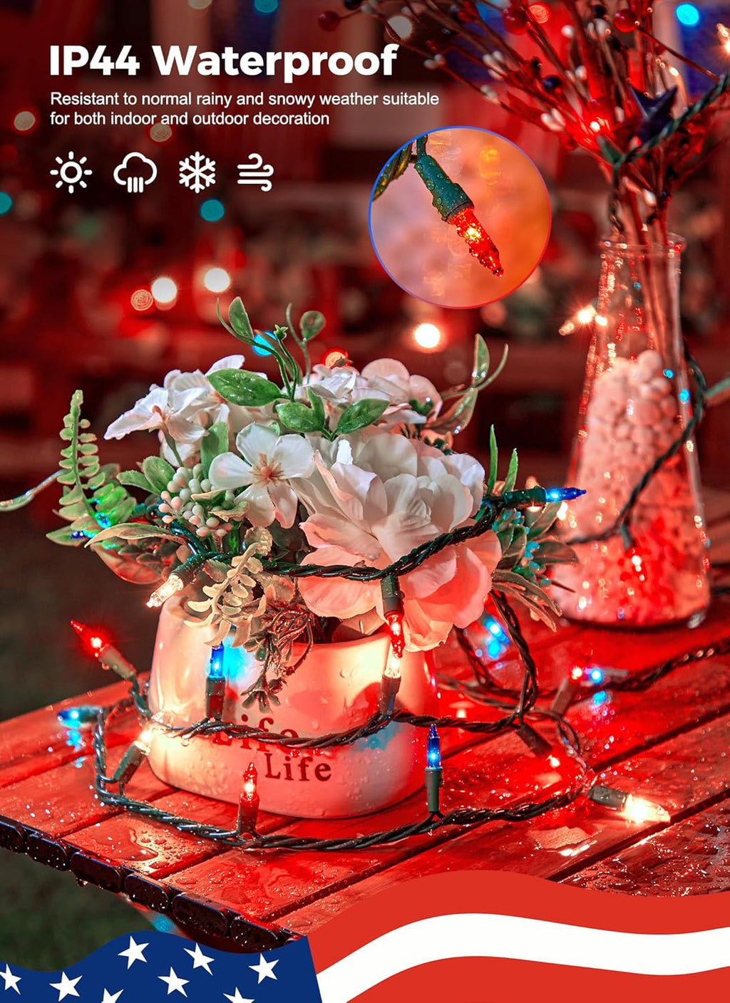 Red White Blue 50 LED Mini String Lights, 13ft Waterproof, Green Wire