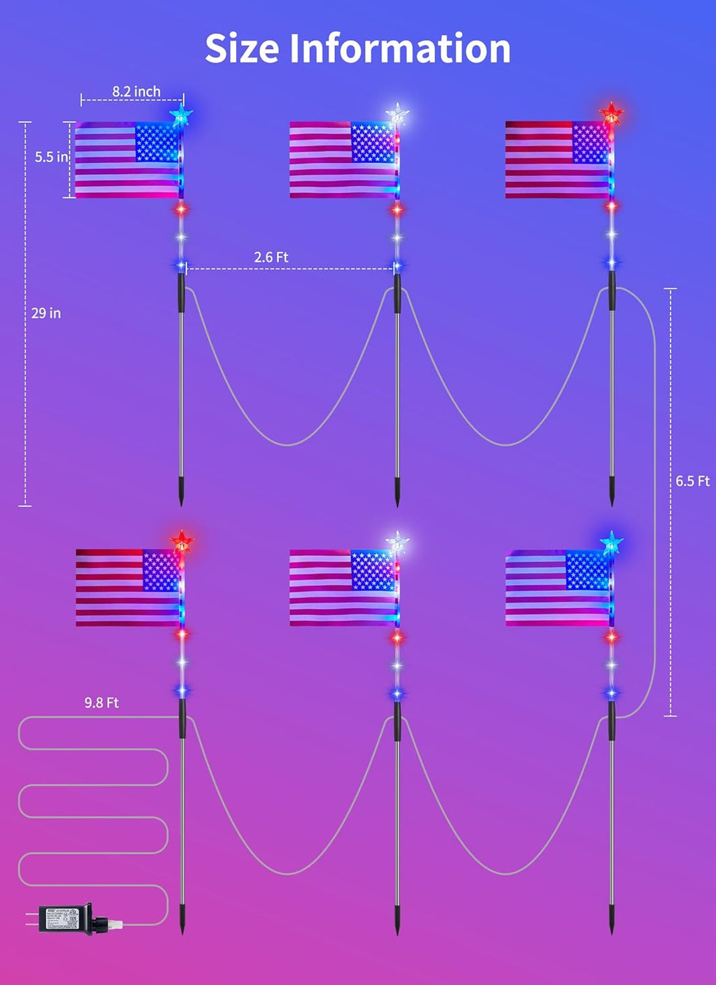 • Fourth of July Outdoor Decorations: Features 6 large flags, each 8.2" x 5.5" with a total height of 29". Stakes spaced 2.6 feet apart with a 9.8-foot lead cord.