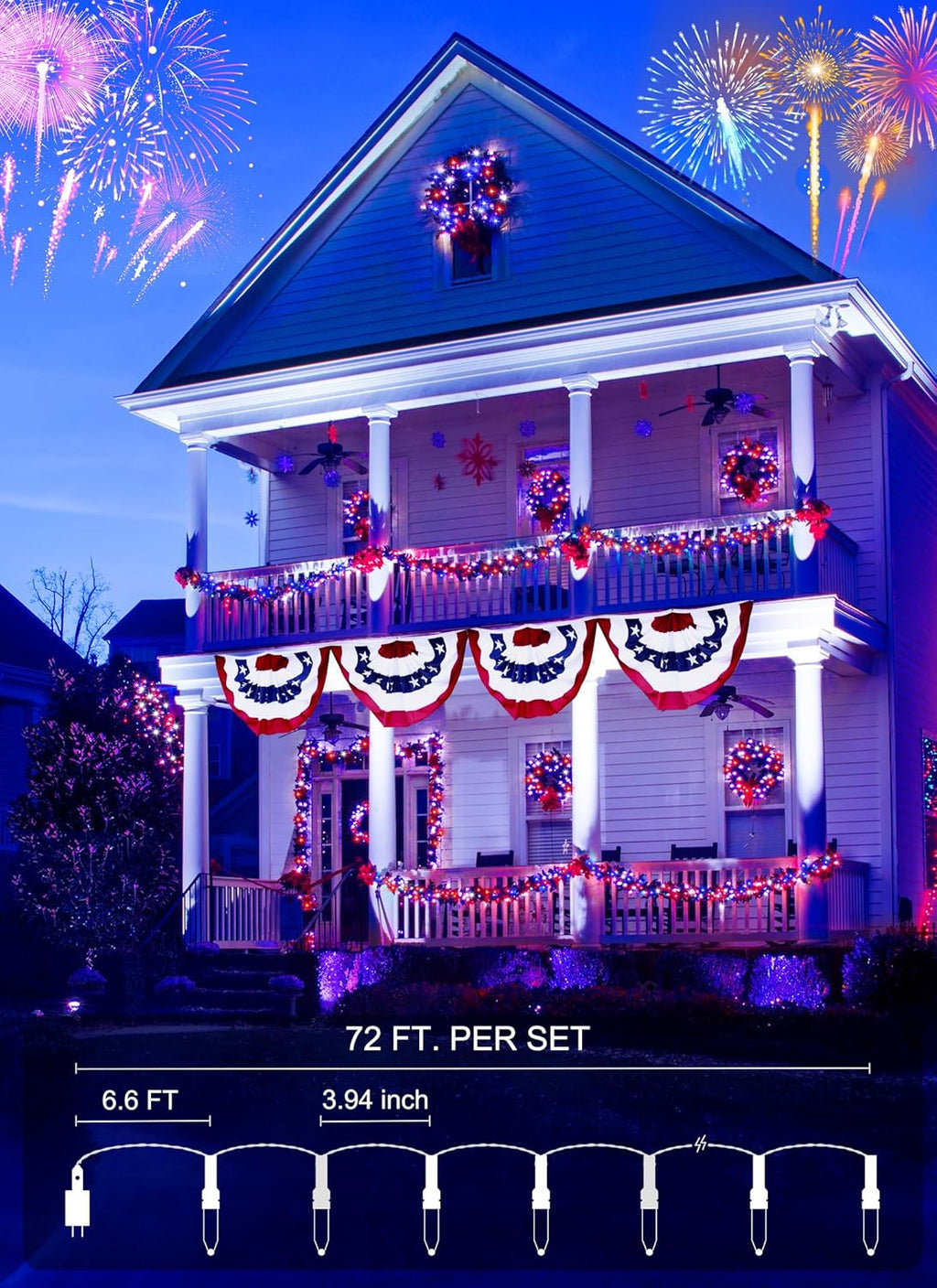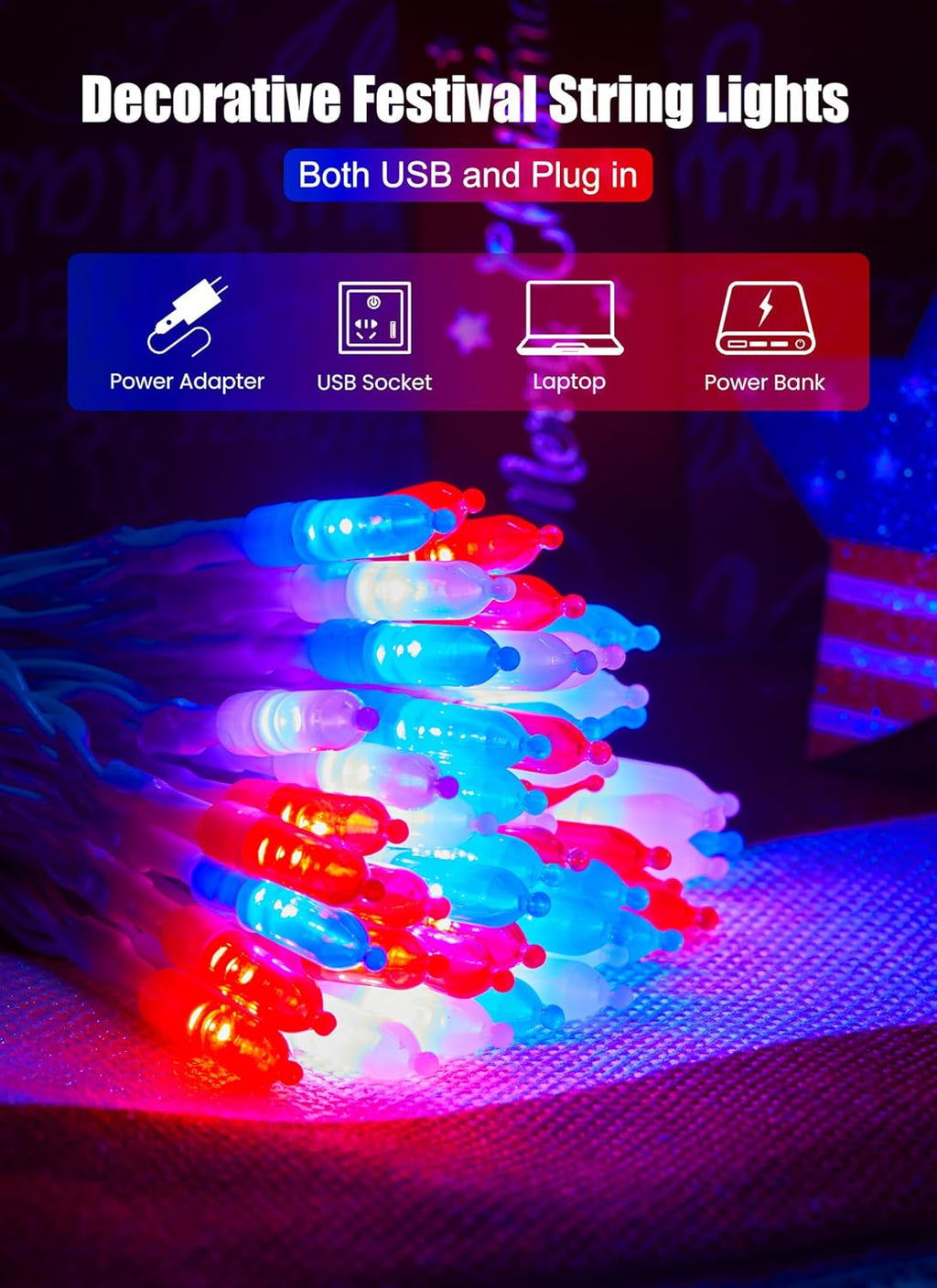 Red White Blue USB-Powered 200 LED String Lights with Remote, Waterproof