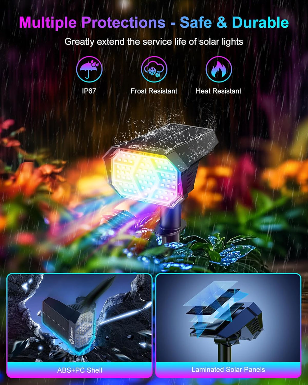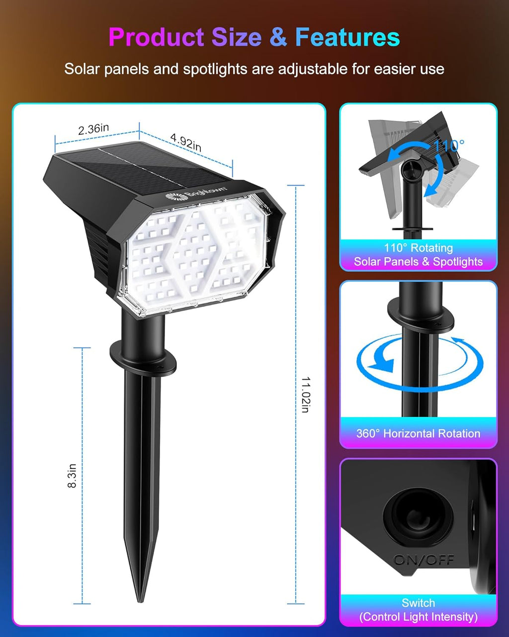 • 9 Colors & 2 Modes: These RGB solar spotlights offer 9 fixed colors and an automatic cycling mode, allowing you to create a vibrant light show with ease.
